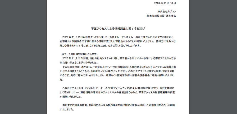 画像:株式会社カプコンより引用株式会社カプコンは2020年11月16日、同社にて発生していた第三者による不正アクセスに関連して、同社グループシステムが保有する顧客情報、従業員情報、採用応募者情報、関係先情報など合計約35万件が外部流